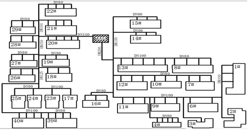 某小區(qū)住宅樓建設于1996年,建筑結構為磚混建筑,建筑面積為54931m2,共30棟住宅樓。2017年繳費739戶,總采暖面積為47141m2。換熱站位于小區(qū)中部,板式換熱機組設計換熱面積為50000m2,循環(huán)泵額定功率為30kW,流量為200m³/h,揚程為32m。庭院管網(wǎng)共分為2個支狀供回水環(huán)路,該小區(qū)供熱管網(wǎng)見圖1所示。