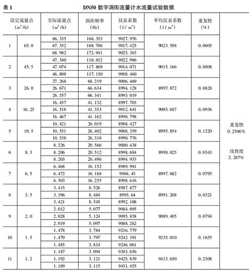 將本文實(shí)現(xiàn)的數(shù)字飽和蒸汽計(jì)量表在上述 50mm 口 徑( 簡(jiǎn)稱(chēng) DN50) 的水流量試驗(yàn)裝置上進(jìn)行試驗(yàn)。先在其正常流量范圍內(nèi)進(jìn)行試驗(yàn),流量從大到小逐漸降低,之后不斷探求其所能測(cè)量的*小流量。每個(gè)流量點(diǎn)試驗(yàn)三次,計(jì)算其重復(fù)性、平均儀表系數(shù)和線(xiàn)性度。水流量試驗(yàn)數(shù)據(jù)如表 1 所示。
