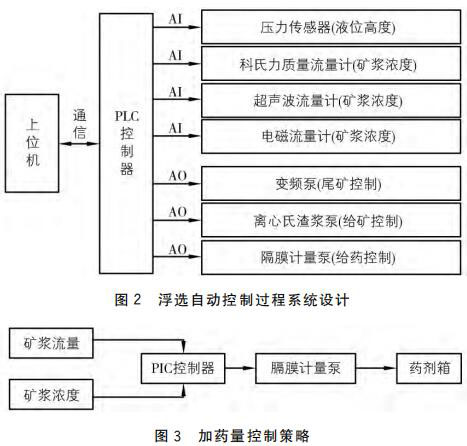 圖3中的礦漿流量與礦漿濃度分別由科氏質(zhì)量流量計和超聲波流量計測得,并 以4~20mA 電流信號傳送給 PLC控制器。由 PLC控制器根據(jù)電流信號值計算出實際的礦漿濃度和礦漿流量值,對上述兩個值進(jìn)行邏輯處理以及運(yùn)算,得出實時加藥量。PLC 控制器將計算出的實時加藥量數(shù)據(jù)以4~20mA 的電流信號發(fā)送給隔膜計量泵,由其控制并實現(xiàn)加藥量過程的自動控制。