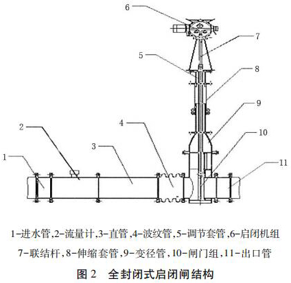包括進(jìn)水管、直管、出水管、丁烷流量計(jì)組和啟閉機(jī)組,進(jìn)水管、直管、出水管從左到右依次連接,丁烷流量計(jì)組安裝在直管和出水管之間且位于出水管的入口處,丁烷流量計(jì)組通過(guò)聯(lián)結(jié)桿與啟閉機(jī)組的輸出端連接。為防止泥沙淤積影響啟閉,丁烷流量計(jì)采用閘板式啟閉結(jié)構(gòu)。密封式啟閉閘為整體封閉管道式,全部采用不銹鋼材料,水流通過(guò)管道流出讓整個(gè)閘井內(nèi)干燥無(wú)水。伸縮套管與波紋管的設(shè)計(jì)讓檢修與清理淤泥更加方便。丁烷流量計(jì)裝有荷載限制器,其布置受力明確、結(jié)構(gòu)緊湊、動(dòng)作可靠。當(dāng)?shù)蹙呱系暮奢d達(dá)到額定值的 110%時(shí),或電機(jī)電流超過(guò)額定電流 150%時(shí),系統(tǒng)自動(dòng)切斷操作電源以保護(hù)設(shè)備安全。