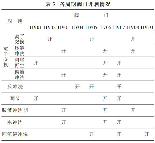 5)回流沖洗周期。 胺液每天都需取樣化驗(yàn),如果發(fā)現(xiàn)胺液中有不溶或懸浮的過渡金屬聚集,則每天運(yùn)行周期結(jié)束后需利用回流液對(duì)樹脂進(jìn)行清洗,以防止腐蝕和樹脂損壞。 如果選擇了此選項(xiàng),PLC程序會(huì)在每天完成目標(biāo)數(shù)量的離子交換周期后,自動(dòng)執(zhí)行回流液清洗周期。 各周期閥門對(duì)應(yīng)開關(guān)情況,如表 2 所示。