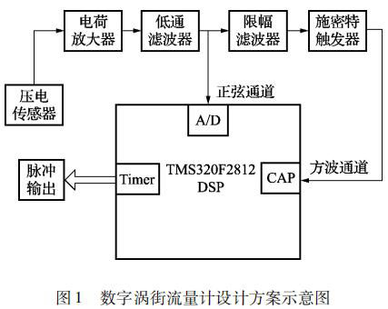 本文設(shè)計的基于 TMS320F2812 DSP 的數(shù)字管道壓縮空氣流量計的信號處理系統(tǒng)由前置放大電路和數(shù)字信號處理電路兩部分組成。本文選用的前置放大電路即為目前被廣泛應(yīng)用的普通管道壓縮空氣流量計的前置放大電路,主要由電荷放大電路、低通濾波電路、限幅濾波電路和施密特觸發(fā)電路組成; 對于經(jīng)壓電傳感器測得的渦街信號采用了頻域分析和時域分析相結(jié)合的方式,即由前置放大電路和數(shù)字信號處理電路相配合。時域分析通道利用 DSP 事件管理器的捕獲模塊,對前置放大電路輸出的方波進行頻率計算,然后再由 DSP 事件管理器通用定時器的比較輸出模塊進行脈沖輸出。頻域分析通道即 DSP對低通濾波電路輸出的疊加了許多噪聲的正弦信號進行 A/D 采樣,再利用 DSP 對 A/D 采樣的結(jié)果進行頻譜分析,從而得出此時渦街信號的頻率,*后由 DSP 通用定時器的比較輸出模塊進行脈沖輸出。系統(tǒng)設(shè)計方案示意圖如圖 1 所示。