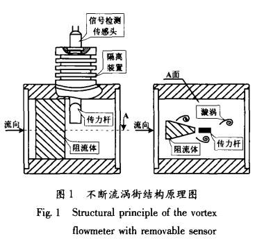 不斷流渦街同樣是以卡門渦街原理為依據(jù)測量流體流速的,但不斷流渦街表體已經(jīng)在結(jié)構(gòu)上有了質(zhì)的改變。如圖1所示,它將普通渦街單一的信號檢測傳感頭改變?yōu)閭髁U與信號檢測傳感頭兩部分,并通過隔離裝置完全隔離。當(dāng)表體中流過流體并產(chǎn)生漩渦時,由傳力桿檢測漩渦的變化,并以力的形式傳遞給信號檢測傳感頭,完成了力信號到電信號的轉(zhuǎn)換過程。雖然傳力桿與流體直接接觸,但其本身只是進(jìn)行力傳輸?shù)母軛U,因此,只對外形尺寸及鋼材選擇上具有要求。而信號檢測傳感頭是通過隔離裝置與流體完全密閉隔離的,再加上隔離裝置本身具有的散熱功能,使得信號檢測傳感頭的使用溫度要遠(yuǎn)遠(yuǎn)低于流體的實際溫度,從而有效地提高了普通信號檢測傳感頭的可測介質(zhì)溫度。同時,不斷流渦街在進(jìn)行維修更換信號檢測傳感頭時,并不影響工藝管道內(nèi)流體的流動,真正實現(xiàn)了信號檢測傳感頭的不斷流拆裝維護(hù)。