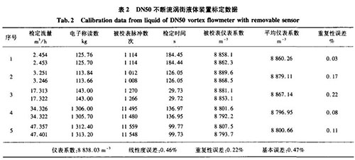 分別用精度0.5級音速噴嘴氣體標(biāo)定裝置、精度0.2級稱重法水標(biāo)定裝置對DN50口徑的不斷流渦街進(jìn)行實際標(biāo)定,其標(biāo)定數(shù)據(jù)如表1、表2所示。