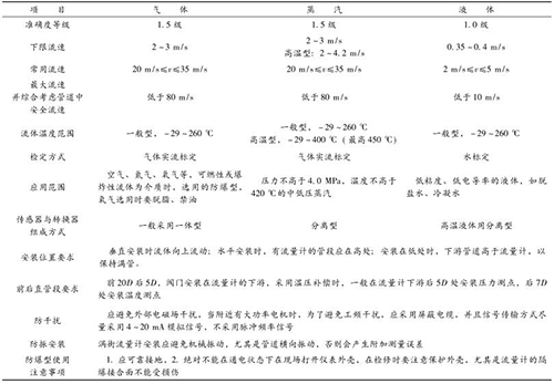 通過上述蒸汽流量計的測量原理和影響因素進行全面的分析,蒸汽流量計在不同介質(zhì)流量測量中的共性、差異性及安裝應(yīng)用注意事項如表4 所示。