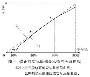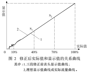 如上所述的基本策略實際上就是修正了40%以下的流量系數(shù)和修正了70%以上的流量系數(shù)。用圖1表示就是改變了40%以下的流量指示值曲線的斜率和70%以上的流量指示值曲線的斜率。