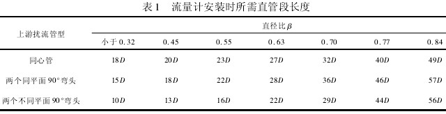 孔板流量計以簡單結(jié)實、成本低廉及無需額外標定等優(yōu)勢在工業(yè)中獲得廣泛應(yīng)用。但它也有自身的缺點:受限于工作原理,量程比限制在3:1~5:1;在水錘作用下,孔板會變形,如果設(shè)計或安裝不當甚至會堵塞管道;孔板的直角邊緣在長期運行后會磨損,特別是在進行蒸汽介質(zhì)測量時會改變孔板特性,影響測量精度,因此必須對孔板進行周期檢查并予以更換;孔板流量計一般需要較長的直管段以保證精度,表1給出了不同直徑比β和不同上游擾流布置情況下所建議的直管段長度。