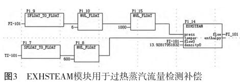 其中COMPENSATE模塊適用于溫度為260~800℃,壓力(絕壓)為0.5~32MPa的工況;而EXHSTEAM模塊適用于溫度為140~560℃,壓力(表壓)為98.6777~15898.6777kPa的工況。假設(shè)過熱蒸汽的設(shè)計壓力為4MPa(表壓),設(shè)計溫度為400℃;過熱蒸汽的實測壓力為PI-101:0~6MPa(表壓),實測溫度為TI-101:0~600℃,流量為FI-101,補償后的流量為FI_101,經(jīng)EXHSTEAM過熱蒸汽特性計算得出設(shè)計密度為13.92817951832kg/m³,則DCS圖形化編程如圖3所示。