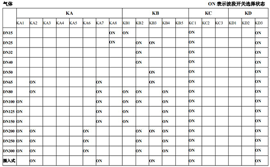 以上表值僅供參考,實(shí)際使用中因液體粘度和氣體密度不同應(yīng)在此值附近調(diào)整,頻率低時(shí)可將 K3 向大口徑方向調(diào)一至三檔。頻率高時(shí)可將 K2 向小口徑方向調(diào)一至三檔。