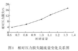 從表1中可以看出,設(shè)計點進(jìn)口壓力相對損失近10%,*小點近3%,*大點近18%,隨流量的增加相對壓力損失變化如圖1所示。