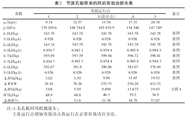 孔板節(jié)流引起風(fēng)機消耗有效功增加,具體計算結(jié)果見表2。