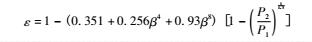 膨脹系數(shù)是對(duì)流出系數(shù)在可壓縮性流體中密度變化的修正。對(duì)于孔板流量計(jì),由于流量計(jì)膨脹既是軸向的又是徑向的,目前主要按照經(jīng)驗(yàn)公式計(jì)算。按照ISO5167,孔板的三種取壓方式采用同一可膨脹性系數(shù)公式,適用于空氣、蒸汽及天然氣等介質(zhì),如下式所示。
