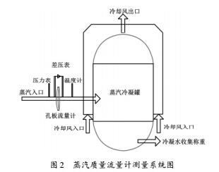 蒸汽流量計(jì)使用的系統(tǒng)圖如圖2所示,圖2中蒸汽經(jīng)過孔板質(zhì)量流量計(jì)后進(jìn)入罐體,罐體外表面有環(huán)形通風(fēng),可用于冷卻罐體。流量計(jì)前后布置有溫度、壓力補(bǔ)償測點(diǎn),同時(shí)將流量計(jì)的實(shí)時(shí)測量結(jié)果進(jìn)行采集匯總。蒸汽進(jìn)入罐體后會(huì)提升關(guān)內(nèi)壓力,同時(shí)會(huì)在罐內(nèi)冷凝,冷凝的熱量通過罐外部冷卻帶走。進(jìn)入罐內(nèi)的蒸汽完全冷卻后可由下部出口將冷凝水排出稱重,將稱重結(jié)果與流量計(jì)實(shí)時(shí)測量結(jié)果進(jìn)行對(duì)比,以驗(yàn)證質(zhì)量流量計(jì)變工況測量準(zhǔn)確性。實(shí)驗(yàn)過程中,隨著蒸汽進(jìn)入罐體,罐內(nèi)蒸汽難以及時(shí)完全冷凝,壓力會(huì)逐漸上升,這會(huì)導(dǎo)致上游流量計(jì)附近蒸汽狀態(tài)也會(huì)隨之變化,即流量計(jì)工作狀態(tài)與設(shè)計(jì)值相比在不斷變化,這種變化會(huì)隨著蒸汽流量的增大而逐漸增大。