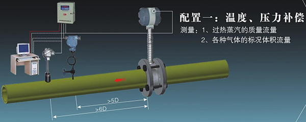 2、溫度補(bǔ)償一體型渦街流量計(jì)還帶有溫度傳感器,可以直接測(cè)量出飽和蒸汽的溫度并計(jì)算出壓力,從而顯示飽和蒸汽的質(zhì)量流量。