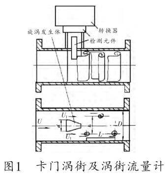 在流體中設(shè)置旋渦發(fā)生體(阻流體),從旋渦發(fā)生體兩側(cè)交替地產(chǎn)生有規(guī)則的旋渦,這種旋渦稱為卡門渦街,如圖1所示。