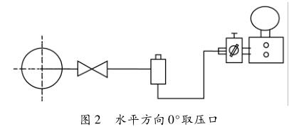 從圖中不難理解,冷凝罐中多余的冷凝水沿著斜坡流回母管,但是在實(shí)際現(xiàn)場(chǎng)中經(jīng)常選用的一次閥是針型閥,如果選用公稱通經(jīng)太小的話,使凝結(jié)水回流不暢而積在針型閥上方的引壓管內(nèi),引起引壓管密度不一致。測(cè)量蒸汽時(shí)母管與冷凝罐進(jìn)行汽液交換包括兩部分,一是母管內(nèi)的蒸汽經(jīng)一次閥進(jìn)入冷凝罐,二是冷凝罐內(nèi)的液體返回母管。在汽液交換時(shí)如果正負(fù)壓管是完全同步,交換的方向也完全一致,孔板取壓口的差壓轉(zhuǎn)換成凝結(jié)水的差壓,并不會(huì)產(chǎn)生差壓值的變化,但是實(shí)際上很難保證這種交換既同步又同向。這樣在蒸汽量小的時(shí)候,2個(gè)引壓管的密度之差乘以sin45°就會(huì)有一差值,這個(gè)差值通過(guò)一系列的計(jì)算會(huì)傳遞到變送器的差壓值,就會(huì)存在不計(jì)或者計(jì)量偏大的現(xiàn)象。如何解決上述問(wèn)題,建議按照?qǐng)D2安裝,水平方向取壓,盡管2個(gè)引壓管的密度還是有差異,由于θ=0°即sin0°=0,就不會(huì)存在差異值。但是還會(huì)存在示值波動(dòng),要解決示值波動(dòng)的問(wèn)題,建議將針型閥換成閘閥或者球閥,要求內(nèi)徑不小于10mm,一次閥門的公稱通經(jīng)也要不小于10mm。