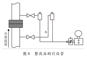 如圖3所示,取壓口和冷凝罐之間存在液封,A段管在一次閥附近形成U形水封,所以這段管的凝結(jié)水無(wú)法靠重力順暢地返回母管。A管內(nèi)的凝結(jié)水,由于流體靜力學(xué)的作用,對(duì)正在冷凝罐內(nèi)的靜壓產(chǎn)生抽吸作用,從而使差壓產(chǎn)生偏移。必須對(duì)引壓管進(jìn)行整改,如圖4所示,引壓管彎曲的弧度標(biāo)準(zhǔn)為90°,嚴(yán)格按照要求作業(yè),消除由于安裝導(dǎo)致的誤差。